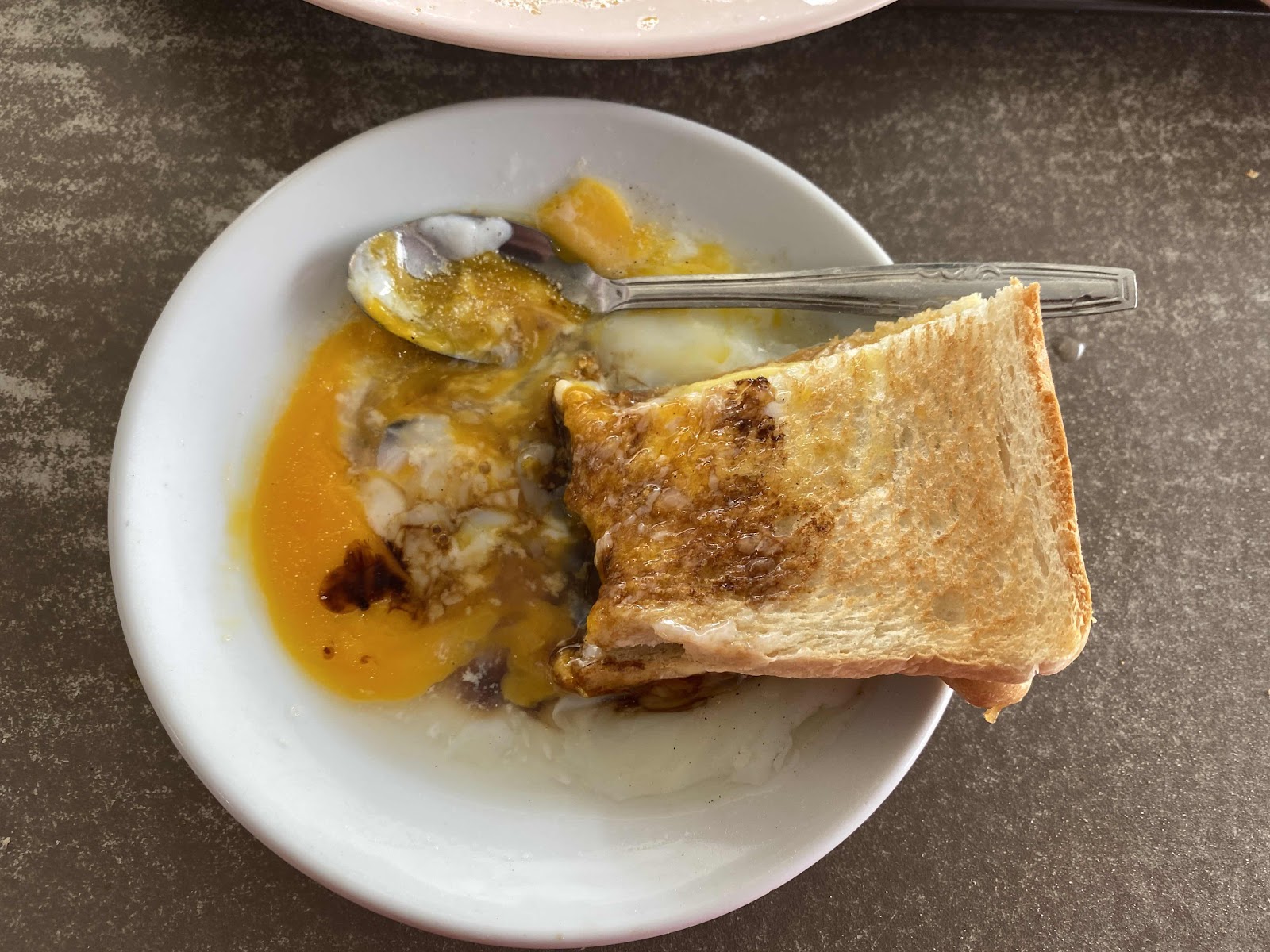Relembrando: pão tostado com manteiga e geléia de ovo com côco, molhado em ovo cozido mole com shoyo e pimenta branca (sem sal).