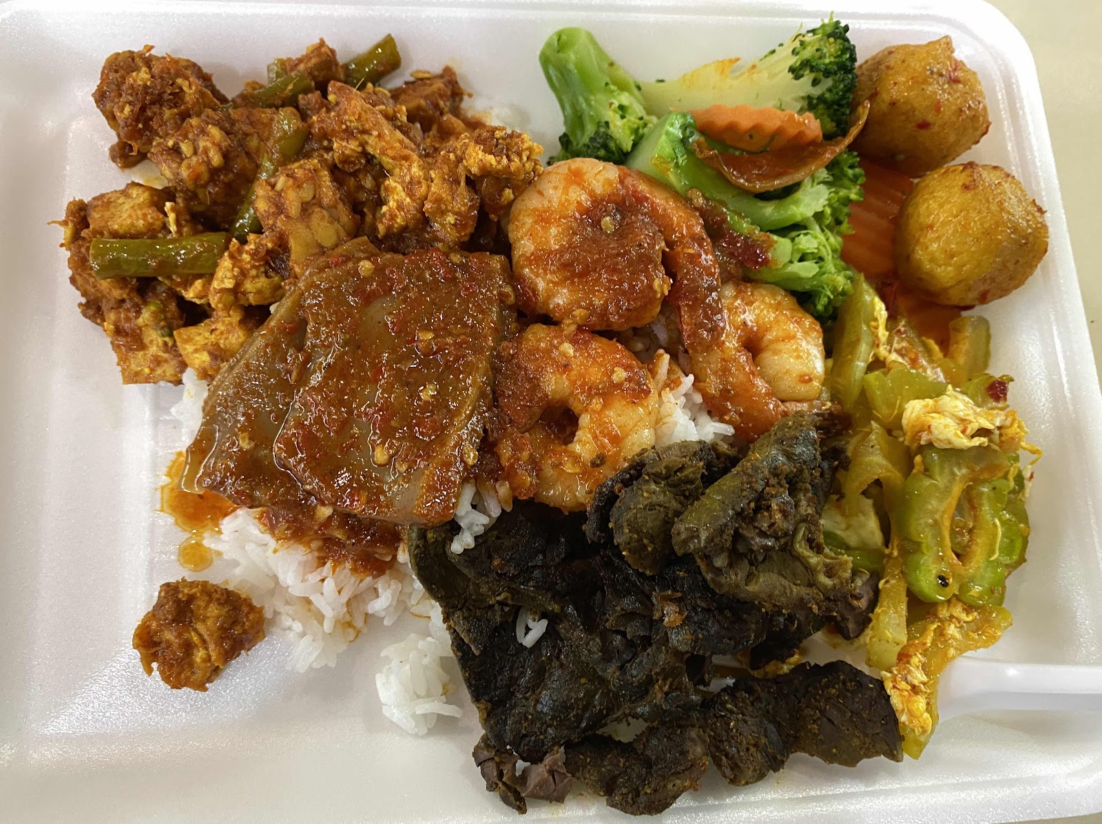 De volta às raízes hoje, fui ao hawker center e encontrei um lugar em frente a uma barraca self-service de buffet malaio. Geralmente é assim que decido o que comer.