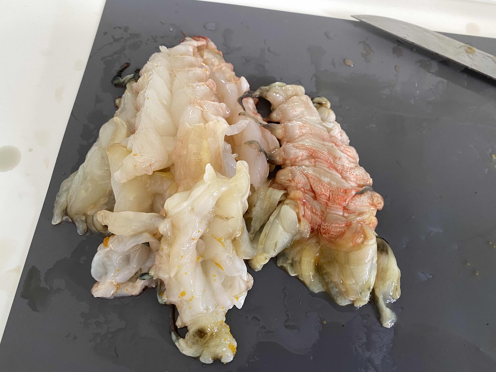 3. Vire a cauda e corte a parte inferior da cauda ao meio, apenas o suficiente para abri-la e puxar a carne para fora.